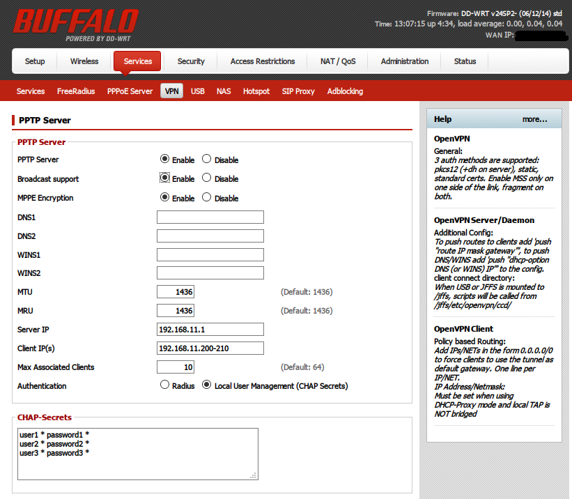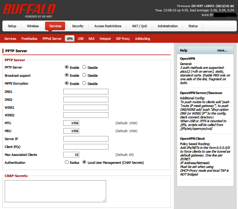 DD-WRT 是一款十分流行的第三方路由器韌體, 已經內置了 VPN 的功能, 以下是在 DD-WRT 開啟及設定 VPN 的方法, 我用的是 Buffalo 專用版 DD-WRT, 但只時介面顏色有點不同, 設定方法跟一般的 DD-WRT 一樣。