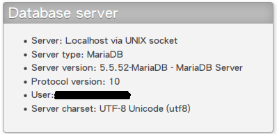 MariaDB [(none)]> select VERSION(); +----------------+ | VERSION() | +----------------+ | 5.5.52-MariaDB | +----------------+ 1 row in set (0.00 sec) |
