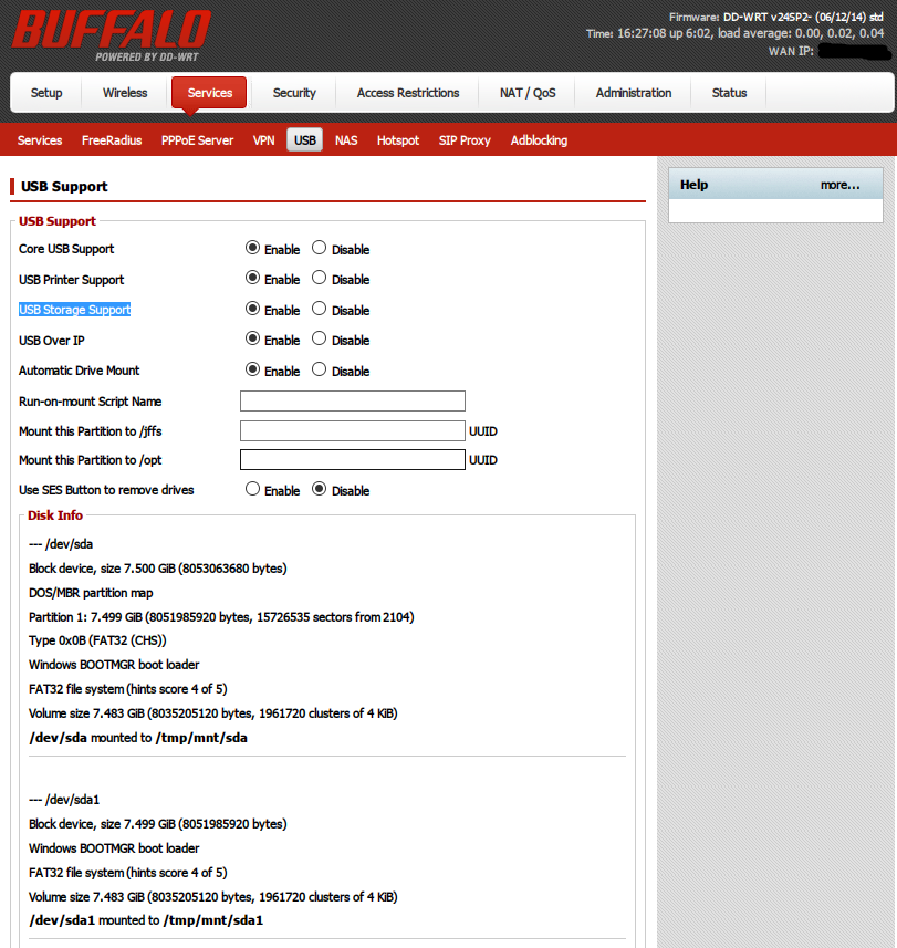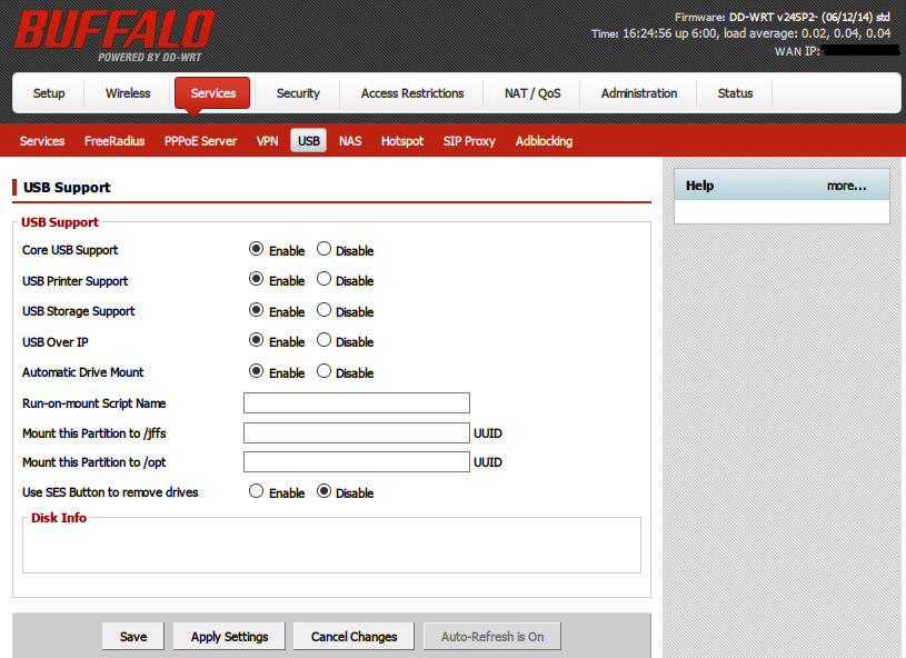 3. 按 “Services” -> “USB”, 将 “Core USB Support”, “USB Storage Support” 及 “Automatic Drive Mount” 选择 “Enable” 开启, 然后按最下面的 “Apply Settings”.
